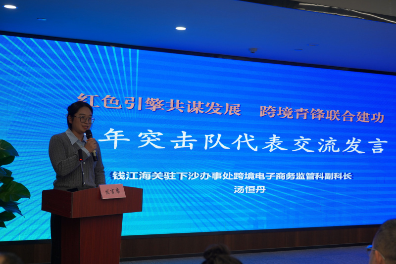 在“红色引擎·共谋发展”环节,来自钱江海关驻下沙办跨境电商监管党支部与国贸云商第一党支部相关负责人结合各自实操领域分享创新实践与未来畅想。海关党支部负责人用“达人”“攻坚”“创新”三个标签分享了党支部的先锋实践,云商党支部负责人则在现场提出倡议,下一步双方就打造“AI+海关”、开辟“绿色通道”、共育“跨境人才”等方面开展合力探索。